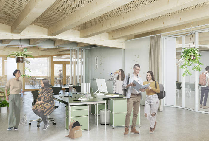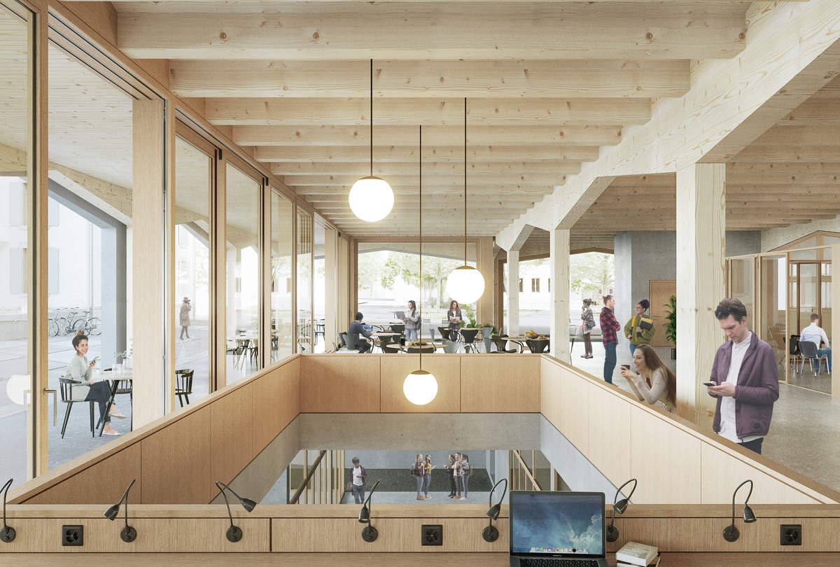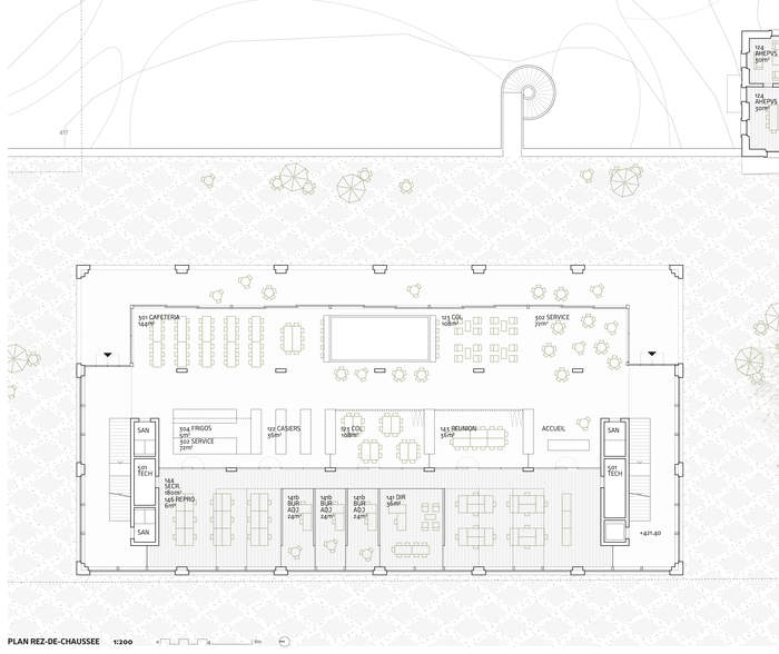 Le rez-de-chaussée interagit avec l'espace public du plateau. Un vaste espace central abrite la cafétéria et les zones de collaboration. De l'autre côté, donnant sur les rails, se trouvent les locaux administratifs.