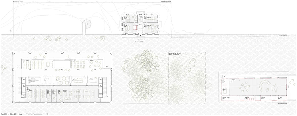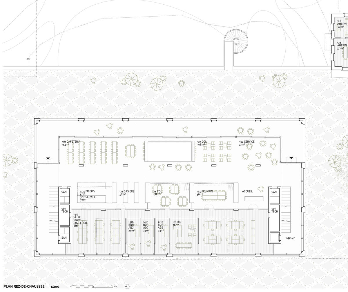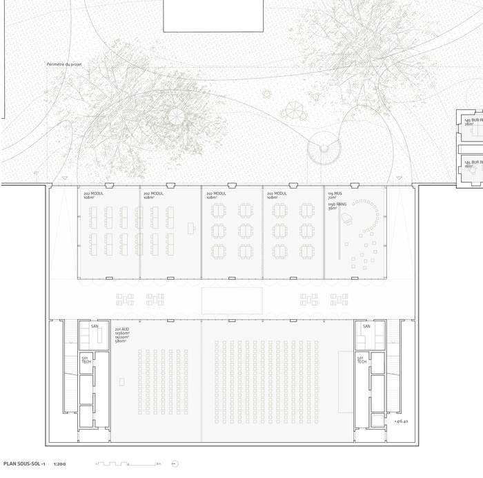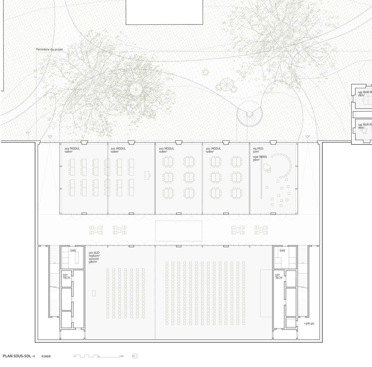 Au rez- inférieur, on trouve les salles de grande capacité, avec un accès direct au parc des habitations.