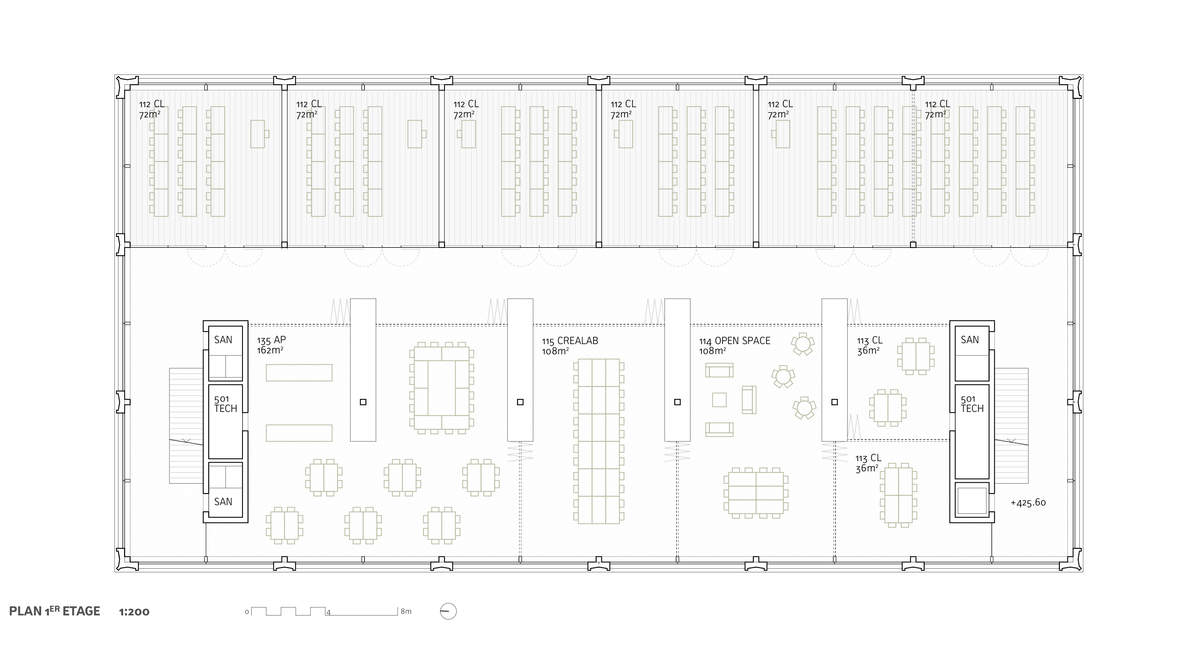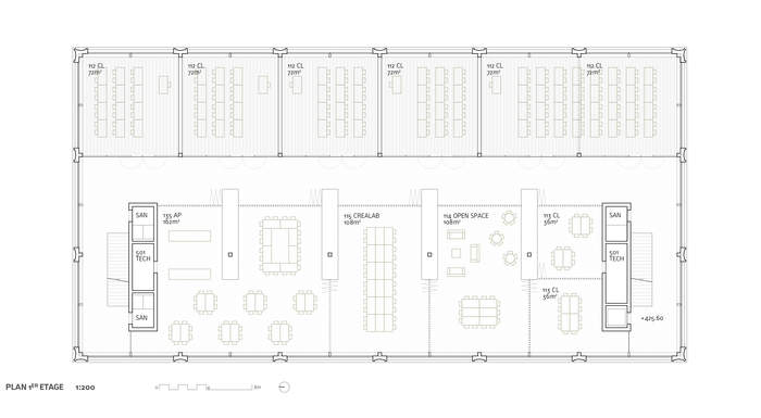 Les étages 1 à 3 sont organisés de manière identique : à l'est se trouvent les salles de classe de type classique, tandis qu'à l'opposé se situe un grand espace évolutif qui accueille les espaces de type collaboratif.