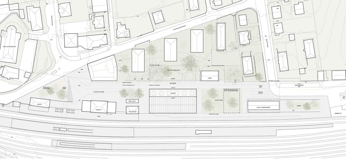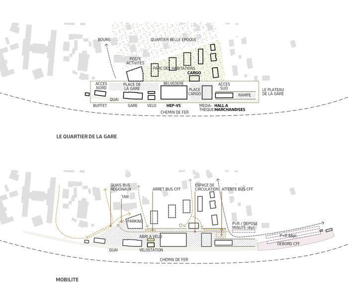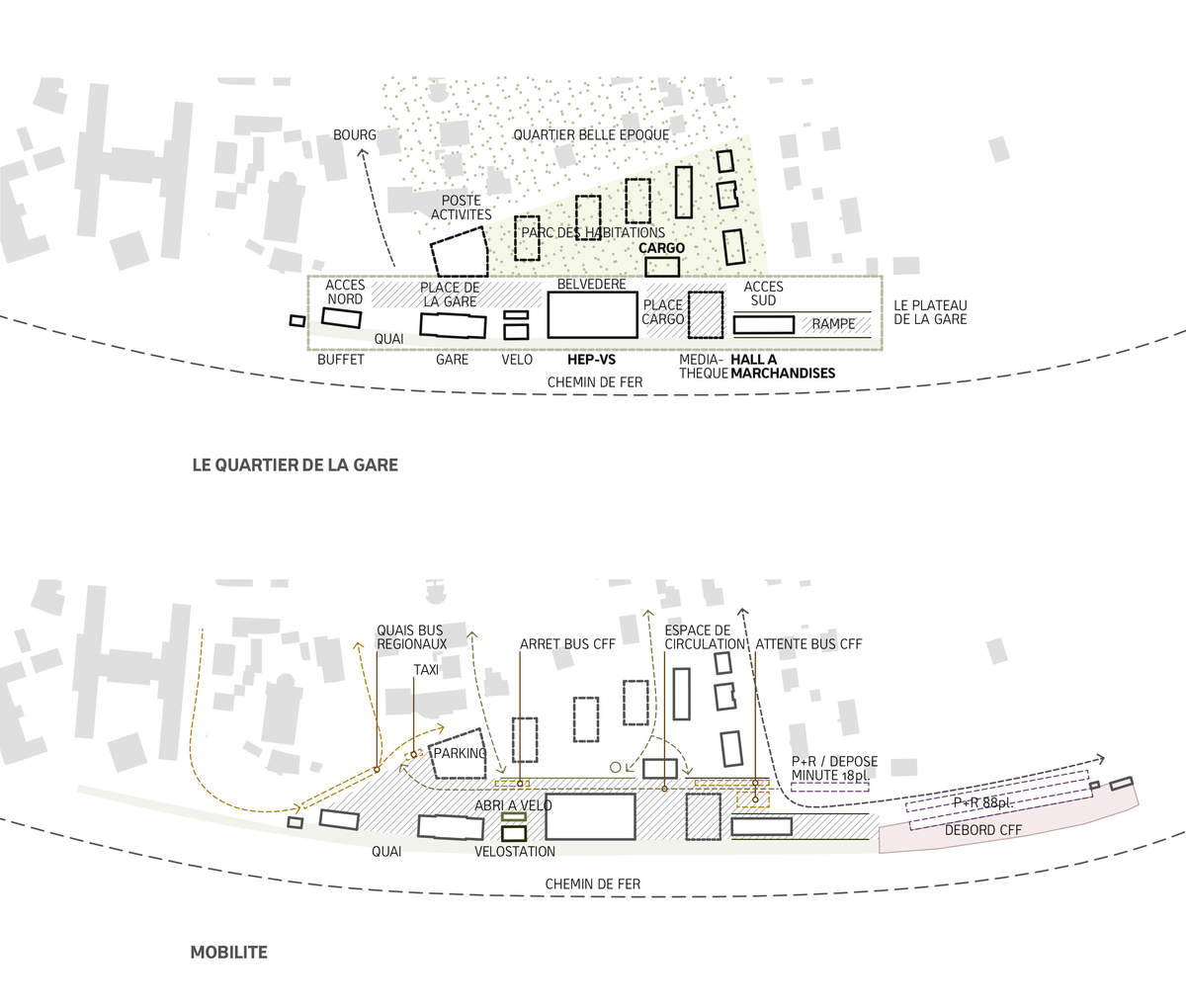 Le nouveau bâtiment HES-VS et la future médiathèque s'implantent au centre du plateau, créant des séquences de places et de venelles à échelle humaine, avec des ambiances et des modes d'utilisation variés. Autour du nouveau bâtiment HES-VS, on trouve au nord la place de la Gare, à l'est le belvédère qui surplombe le parc des habitants, et au sud la place Cargo.