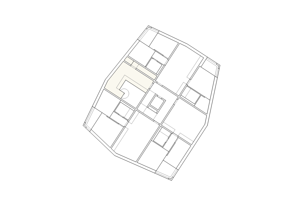 Le nouvel immeuble d’habitation forme la tête d’îlot et achève le système du tissu bâti. Il transporte la lecture des bâtis historiques dans le présent et fonctionne tel un pivot entre l’îlot patrimonial et les barres modernistes. Sa compacité et simplicité volumétrique permettent d’offrir à la coopérative d’habitation un immeuble de qualité, tout en garantissant un budget d’investissement abordable.