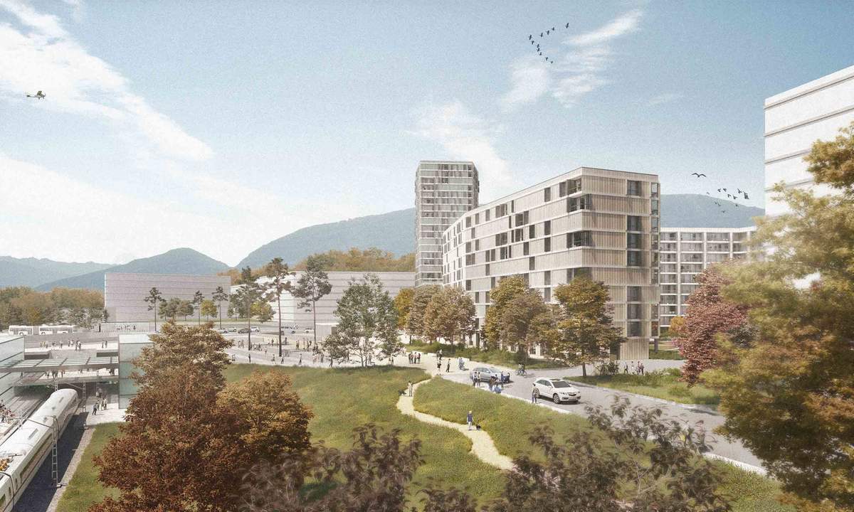 Transformation et restructuration du secteur complété par la construction de 300 logements, surfaces d’activités et d’un parking souterrain. L’implantation des bâtiments tient compte des alignements existants, marquant le boulevard de Saint-Julien, accompagnant le coteau de Lancy et liant la patinoire au pôle multimodale. Le projet délimite clairement des pièces urbaines. Le vide qu’elles dégagent met en valeur une grande place en forme d’étoile s’accrochant au tissu urbain existant et futur. Une tour s’ouvre de manière périphérique sur le pôle offrant un identifiant vertical dans le territoire.