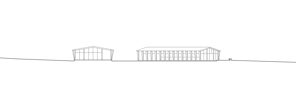 Le site se divise en trois zones bien distinctes: au sud un chemin d’accès en lien avec la ferme Roch; à l’ouest une aire d’animation prend place sur un terrain à faible pente et un amphithéatre naturel; à l’est une grande plaine est utilisée comme pâture pour les bêtes. La cour centrale fait le lien entre les parties d’activités extérieures, les espaces de travail avec les animaux et la partie d’accueil. Le bâtiment proposé s’intègre à la topographie existante tout en cherchant à faire la liaison entre les trois secteurs identifiés. Ainsi, il permet de poursuivre la morphologie de hameau présente sur le site. Le bâtiment, bas et allongé, suit la déclivité du terrain. Sa forme ainsi que son alternance de pleins et de vides permet de créer des vues sur tout le terrain et n’en fait pas un volume opaque coupant le paysage.