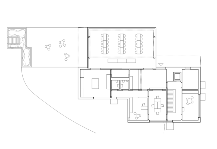 Le bâtiment est composé de deux volumes bien distincts, mais intimement liés, qui s’intègrent dans le gabarit du PLQ. Le premier, constitué essentiellement d’un volume bas, comprend la salle polyvalente en lien avec l’espace public et toutes les «dépendances » liées au fonctionnement de la salle. Le second est un volume compact sur trois niveaux, en retrait de la place. Il offre des espaces lumineux, tout en limitant les vis-à-vis directs avec les logements adjacents. Il s’ouvre sur les quatre orientations et comprend les ateliers et le local pour les adolescents. Au sous-sol se trouvent les pièces de musique et l’atelier de construction. Cette modularité rend le bâtiment extrêmement fonctionnel et lui permet de s’adapter à une utilisation différenciée des espaces en tout heure. Très bien isolé, le bâtiment est labellisé MINERGIE. Il est constitué de façon classique - mur béton, isolation périphérique - associé à une toiture extensive ce qui lui permettra de bénéficier d’une grande inertie. L’été, le rafraichissement naturel du bâtiment est effectué, durant la nuit, par des ouvrants de ventilation protégés qui évitent de refroidir le bâtiment par des moyens gourmands en énergie. La production de chaleur est assurée par le chauffage à distance CADIOM.