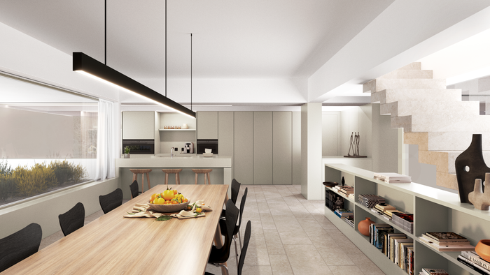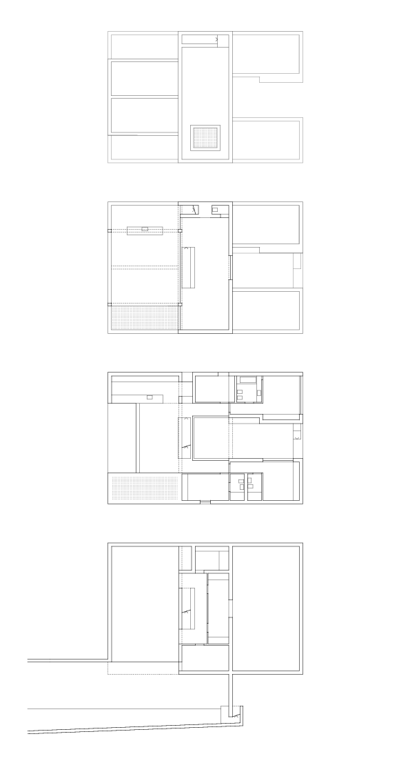 Un escalier positionné au centre de l’habitat relie les différents niveaux et agit comme un élément pivot du plan. Il offre aux usagers un parcours à la luminosité alternée et ponctué d'espaces variés.